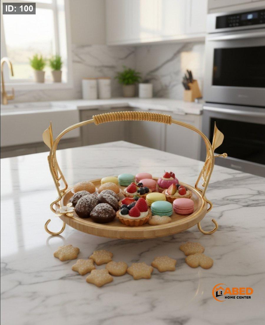 تُعد هذه القطعة تحفة فنية تضفي لمسة من الرقي على مائدة الضيافة، حيث تمزج بين الخشب الطبيعي والمعدن الذهبي المصقول بتصميم انسيابي فريد