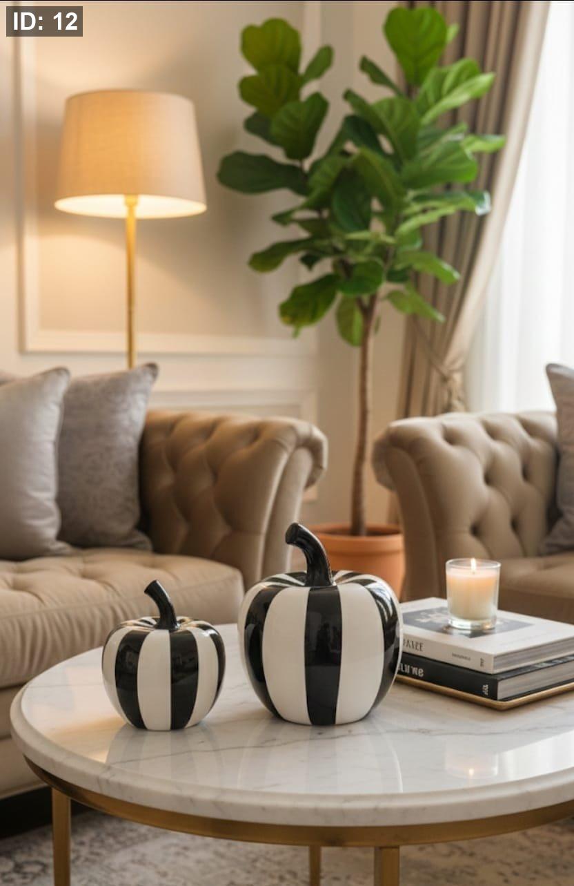 ديكور القرع المخطط بالأسود والأبيض يضيف أناقة راقية لأي طاولة قهوة أو زاوية جلوس. تصميم أنيق يناسب كل المواسم ويعطي بيتك طابع مودرن مميز ✨