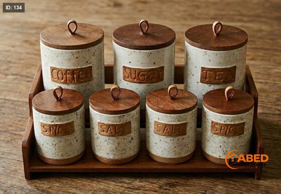 الطقم مكون من ٣ سكريات حجم كبير و٤ سكريات حجم صغير و رف خشب البامبو