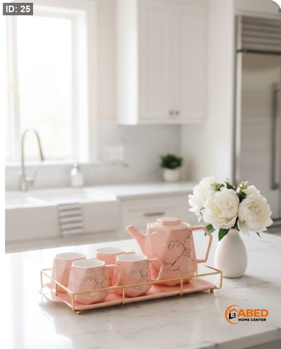 طقم شاي أنيق باللون الوردي مع نقشة رخام ناعمة ولمسات ذهبية مميزة.
