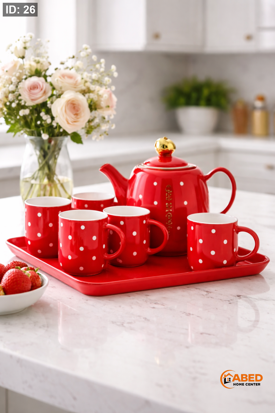 طقم شاي مميز باللون الأحمر مع نقاط بيضاء جذابة ولمسة ذهبية على الغطاء.