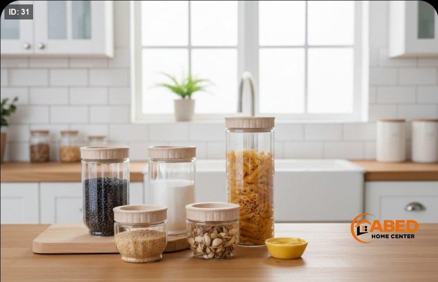 تصميم زجاج شفاف مع أغطية محكمة الإغلاق بلون خشبي أنيق، يحافظ على الحبوب والمكرونة والسكر طازجة لفترة أطول.