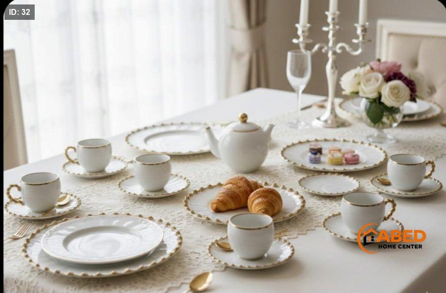 طقم سفرة فاخر باللون الأبيض مع حواف ذهبية مزخرفة بتفاصيل دقيقة وأنيقة.