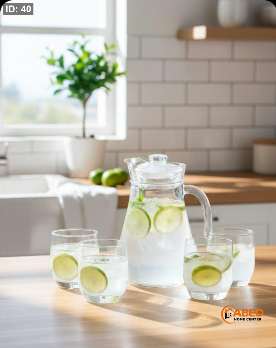 طقم مشروبات يتكوّن من إبريق زجاجي أنيق و4 كاسات متناسقة.