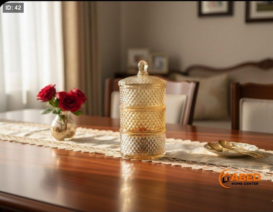 علبة ضيافة زجاجية بثلاث طبقات بلون ذهبي شفاف وتصميم مزخرف أنيق.