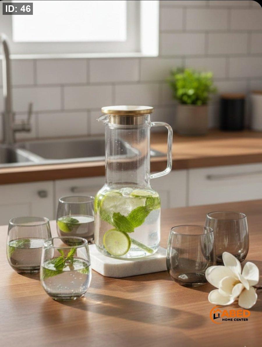 طقم مشروبات أنيق يتكوّن من إبريق زجاجي شفاف بغطاء ذهبي مميز مع 6 أكواب متناسقة.
