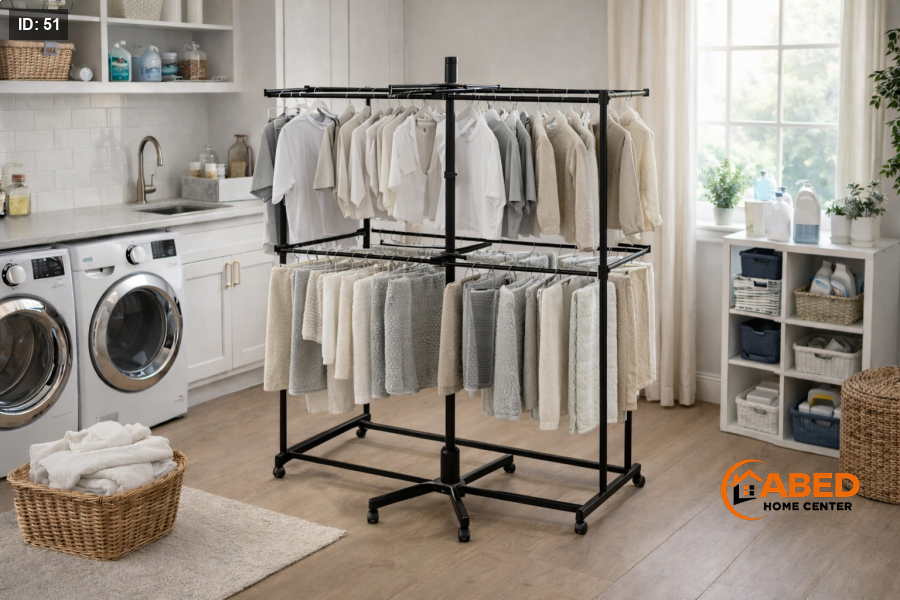 منشر ملابس معدني بطبقتين مع عجلات لسهولة الحركة.