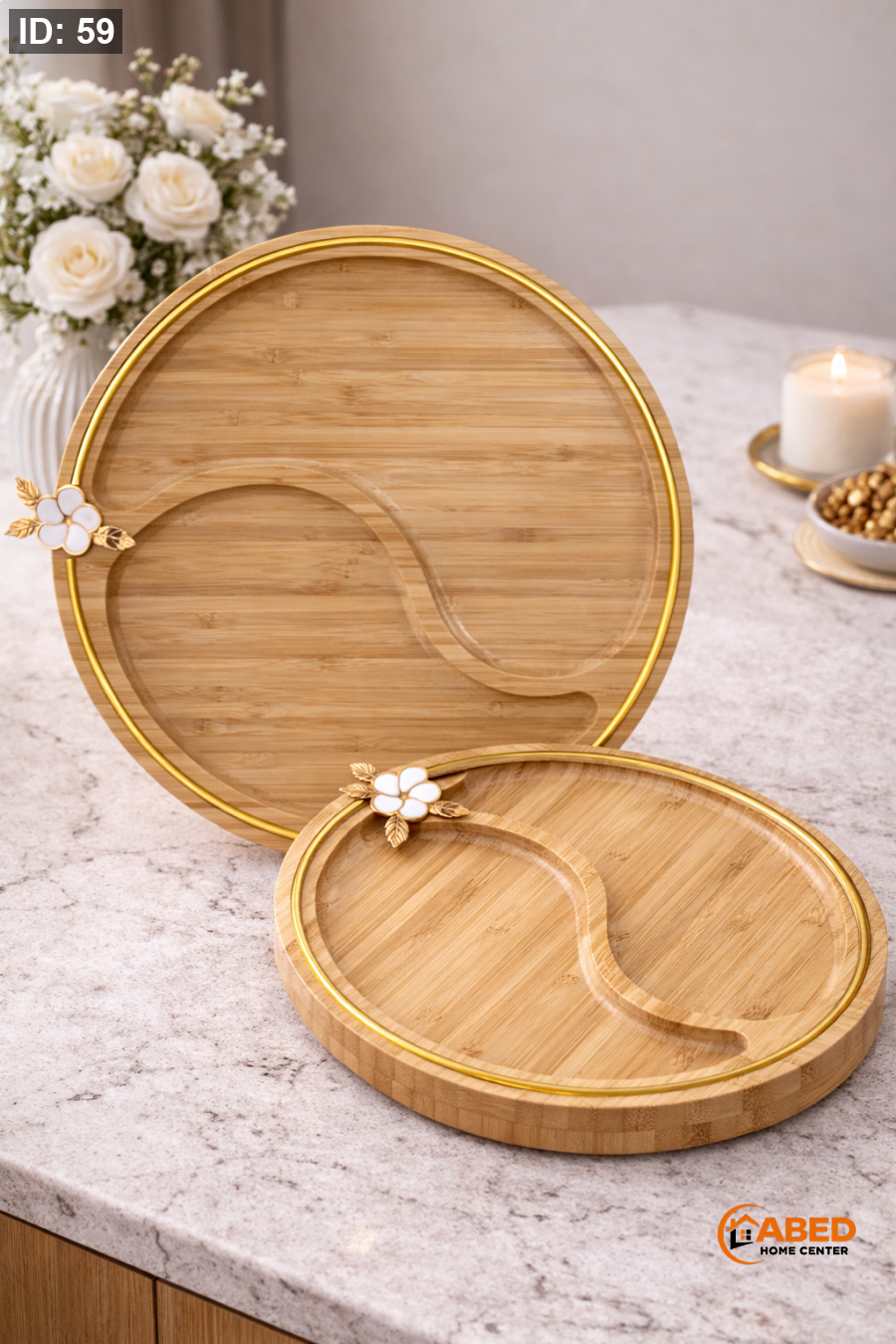 طقم قطعتين صينية تقديم خشبية بتصميم عصري ولمسة ذهبية أنيقة، مقسمة لعرض الضيافة بشكل مرتب وجذاب. مثالية للحلويات والمكسرات في كل مناسبة ✨