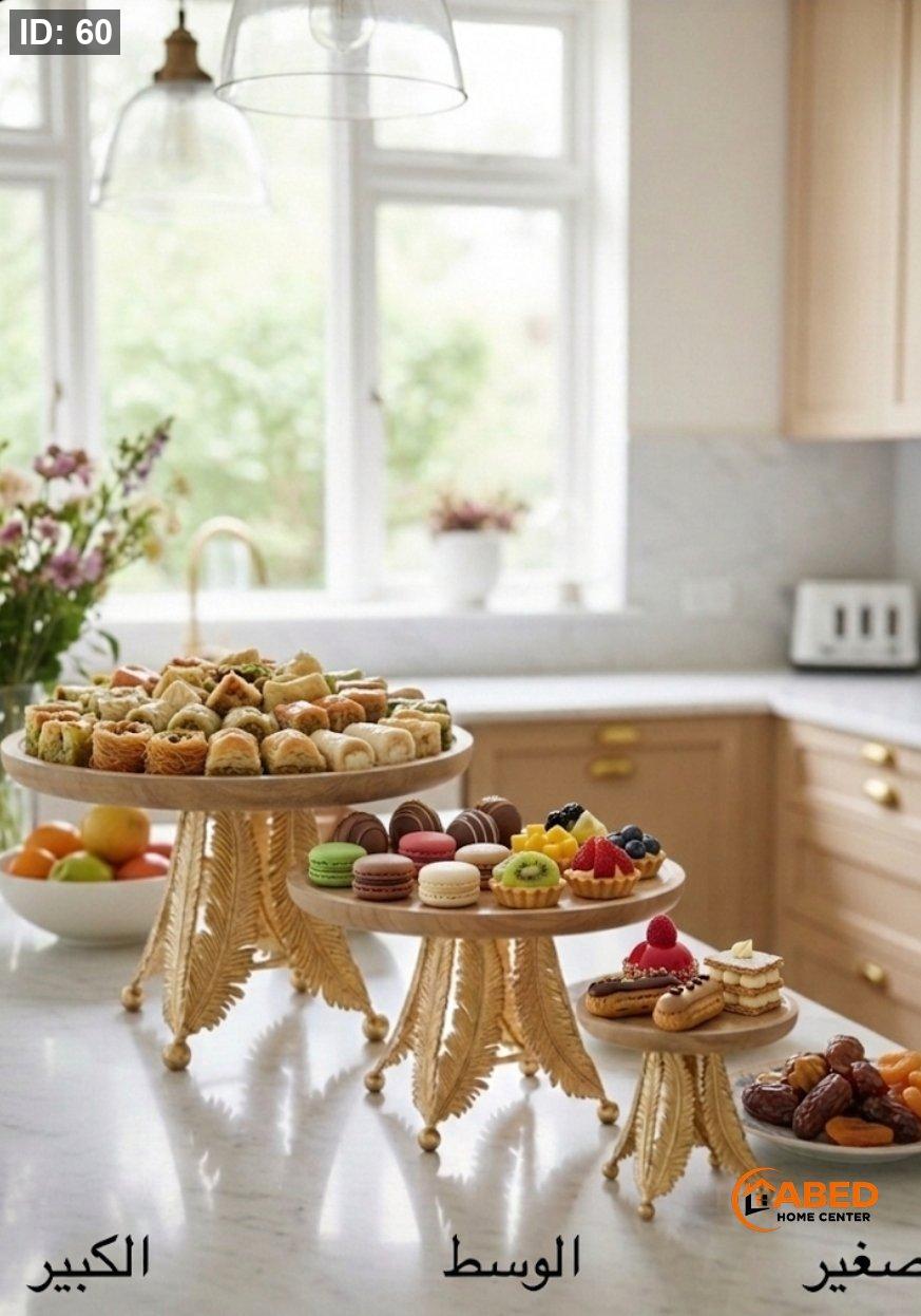 ستاند تقديم خشبي بقاعدة ذهبية فخمة، يجمع بين البساطة والرقي ليمنح ضيافتك لمسة أناقة مميزة ✨