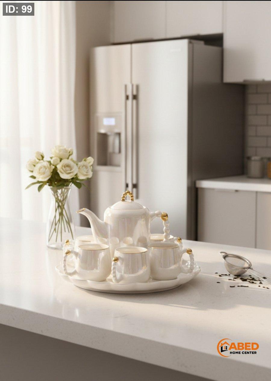 يتميز هذا الطقم بتصميم عصري وأنيق يجمع بين الفخامة والبساطة... يتكون هذا الطقم من ابريق وصينية و٦ اكواب